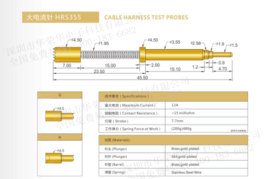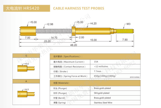 大電流針用于高電流行業的測試。主要測試、功能測試、信號傳輸、供電、生產期間以及作為內置的觸電元件,還有一項應用用途是精確測量,針對該用途要用電阻很低的測試探針,所以也叫底電阻探針。