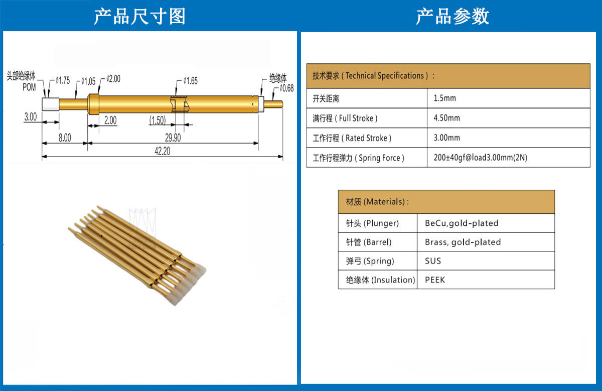 產品簡介:KGZ165探針、1.65mm測試針、總長42.20mm、彈簧針、測試針