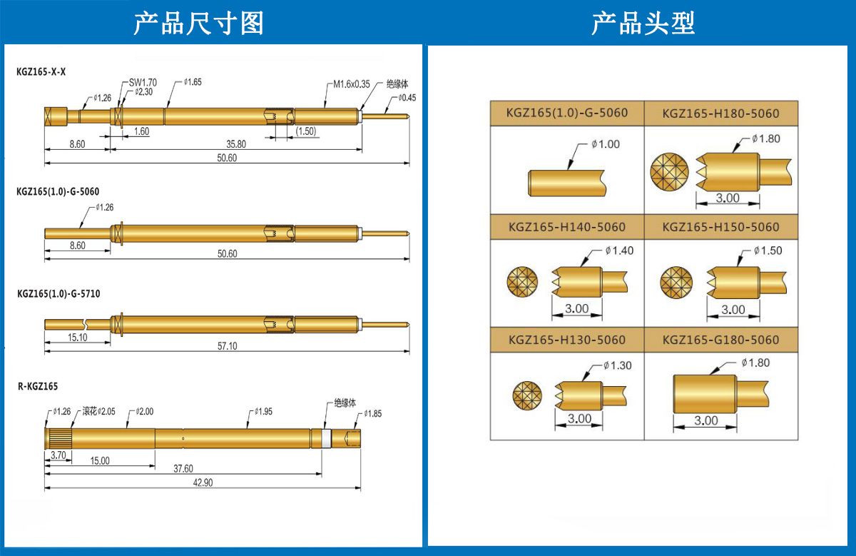 產(chǎn)品簡介:KGZ165探針、1.65mm測試針、總長50.60mm、彈簧針、測試針