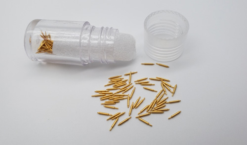 隨著社會的不斷科技化,人們的生活水平也不斷的提高,手機、電腦、汽車、智能手表等也不斷的普及,對探針的需求也越來越大! 探針是電測試的接觸媒介,為高端精密型電子五金元器件。它在各個領域都有應用,例如在醫療、航空航天、生物、計算機等領域都有的應用。而不同型號的探針,所用的材質及價格也會不同。探針的材質主要有鈹銅、磷銅、黃銅、SK4、等,今天主要給大家講解一下探針表面為什么要進行鍍金處理? 簡單來說,鍍金就是為了防止銅生銹,生銹之后產生的銅綠會增加電阻,探針的穩定性及使用功能也會受到影響。 一、鍍金的好處: 1.鍍金層延展性好、易拋光、耐高溫,具有很好的抗變色性能。在銀層上鍍金可以防止銀的變色;金合金鍍層可呈現多種色調,故常用作裝飾性鍍層,如鍍首飾、鐘表零件、藝術品等。 2.鍍金具有較低的接觸電阻、導電性能良好、易于焊接、耐腐蝕性強、并具有一定的耐磨性(指硬金),因而在精密儀器儀表、
