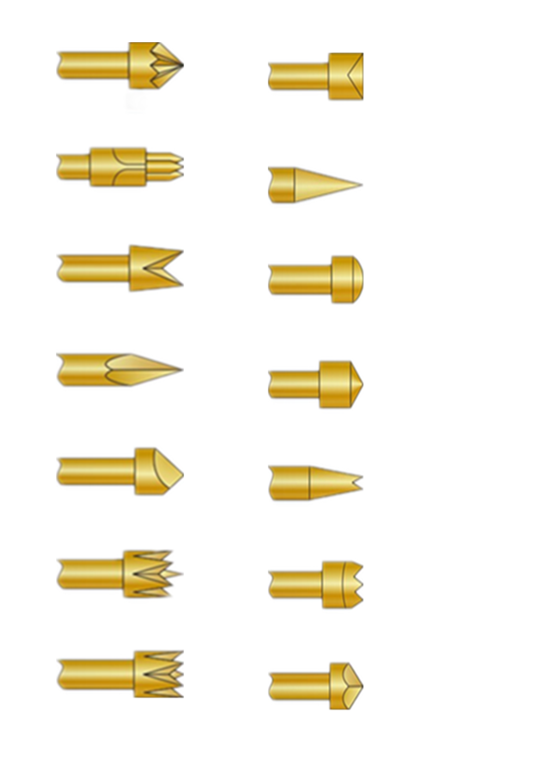 探針是用來測試線路板的開路或短路的,在測試治具中,探針是一個媒介,探針放在針管里,探針頭的接觸待測物,另一端的套管引出線將信號傳導出去,接收回來的信號在測試機里處理;也可以通過探針的測試來傳輸電流活電壓來判斷線路板的情況。在測量中探針頭是主要的使用部位。探針的頭型分為很多種,因為不同的測試點需要不同的頭型;比如:梅花頭的被測點是平片或凹狀.......下面我給大家總結一下所有的探針頭型的用法吧(一)杯頭 ——主要用于接觸接頭,測試長導腳,端子及繞線柱尖頭 ——主要用于接觸焊盆,測試導腳、焊點及污染之PC板或穿刺污染層,刺透力一般。圓頭 —— 一般用于接觸焊盆、焊墊及金手指,確保不留牙印。圓錐頭 —— 測試貫空孔,焊墊及金手指小四爪 —— 測試焊墊及金手指 ,適合細線測試,不沾灰塵及污染物梅花頭 —— 測試長導腳